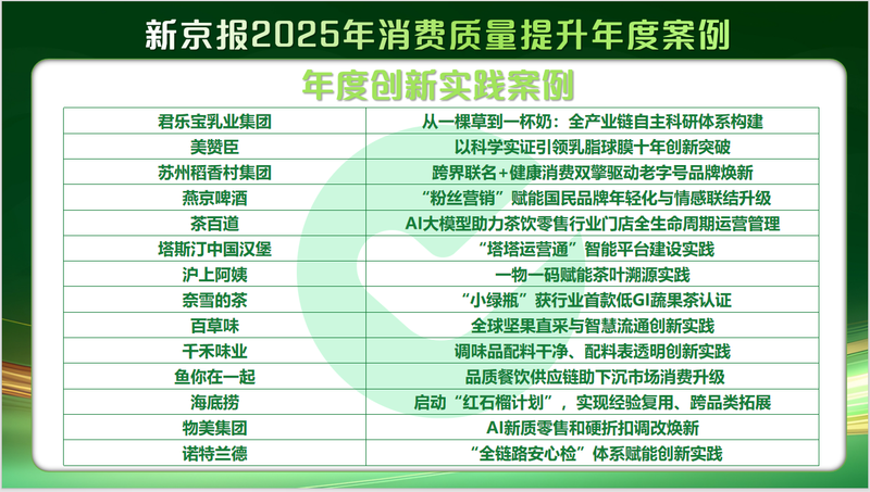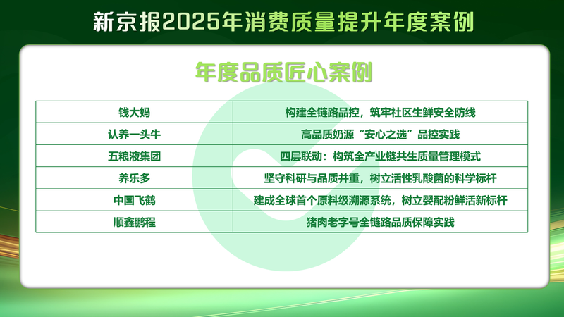 历时一个多月的征集与评选,有29家政府部门、企业团体最终入选“消费质量提升年度案例”。其中,北京市东城区文旅局、北京市朝阳区商务局、泉州市文化广电和旅游局、伊利集团等9家企业入选“年度社会责任案例”;钱大妈、认养一头牛、五粮液集团、养乐多、中国飞鹤、顺鑫鹏程等6家企业入选“年度品质匠心案例”;君乐宝乳业集团、美赞臣、苏州稻香村集团、燕京啤酒、茶百道等14家企业入选“年度创新实践案例”。