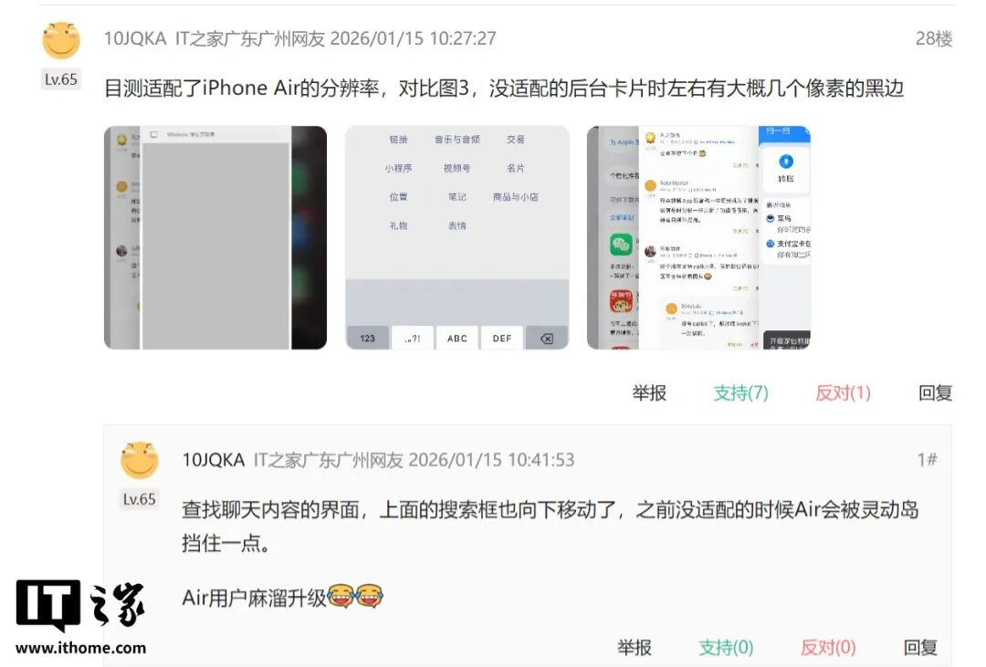 根据IT之家家友反馈,微信 iOS 8.0.68 正式版适配了 iPhone Air 的分辨率。