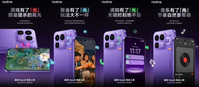 真我Neo8在外观设计上带来全新突破。透明玻璃后盖采用新一代漫反射工艺,挑战透明设计工艺天花板,光线穿透后形成层次丰富的明暗变化,呈现立体金属高质感。另外,觉醒光环系统焕新回归,全面融入系统交互各场景。游戏击杀、音乐律动、来电通知、充电状态、拍照倒计时等场景均有对应光效联动,并带来全新智慧弹码闪烁光效,翻转幸运色功能。真我Neo8提供起源白、机甲灰、觉醒紫三款全新配色,全系标配的磨砂金属中框与大R角设计,更实现手感与颜值兼得,质感全面升级。