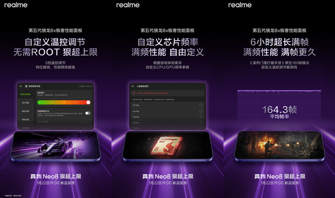 2026年1月16日。真我Neo8性能配置正式揭晓,将于1月22日19:00开启产品发布会。真我Neo8全面构建三层性能金字塔:第五代骁龙8旗舰芯提供核心性能释放,GT性能引擎实现智能调度优化,行业唯一极客性能面板带来高阶自定义,三层协同狠超性能上限,开启高阶性能时代。搭配全球首发165Hz三星苍穹屏,全面打造”165Hz潮玩电竞旗舰”。