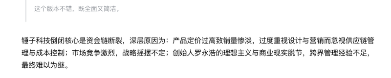系统对比完8个思考后得出结论,“锤子科技倒闭核心是资金链断裂,深层原因为:产品定价过高致销量惨淡,过度重视设计与营销而忽视供应链管理与成本控制;市场竞争激烈,战略摇摆不定;创始人罗永浩的理想主义与商业现实脱节,跨界管理经验不足,最终难以为继。”