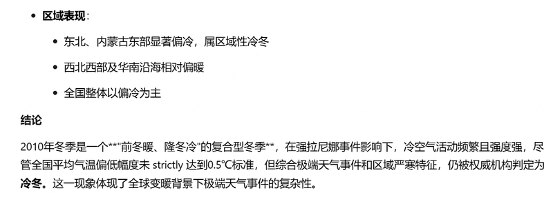 最后系统结论为,2010年冬季是一个“前冬暖、隆冬冷”的复合型冬季,在强拉尼娜事件影响下,冷空气活动频繁且强度强,尽管全国平均气温偏低幅度未 strictly 达到0.5℃标准,但综合极端天气事件和区域严寒特征,仍被权威机构判定为冷冬。这一现象体现了全球变暖背景下极端天气事件的复杂性。