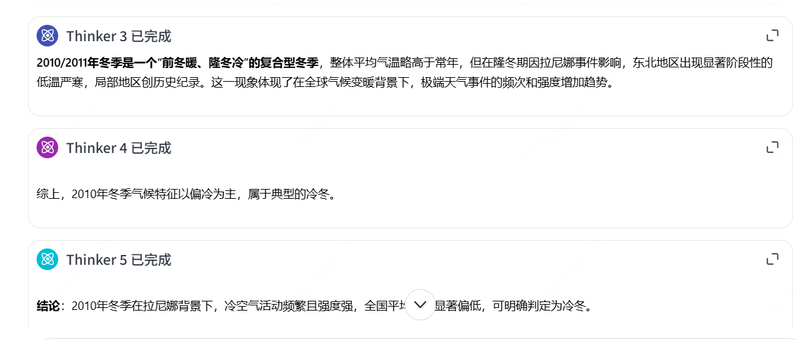 页面显示了8个思考结果分析:2010年冬季应该是指2010年12月至2011年2月,Thinker #7提到“2009年12月至2010年2月”作为2010年冬季,这是错误的。根据国家气候中心的标准,冬季平均气温较常年偏低0.5℃以上才达到冷冬标准。Thinker #3和#8提出了不同观点,认为整体未达冷冬标准。