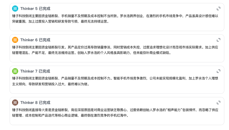 记者输入“100字概括罗永浩的锤子科技倒闭原因?”系统分析显示,除了字数要求外,Thinker #1提到“内部动荡和战略摇摆”,Thinker #2提到“管理经验缺乏”,Thinker #3提到“融资困难”,Thinker #4强调“供应链”,Thinker #5提到“跨界创业”和“过度投入营销研发”,Thinker #6提到“营销成本失控”,Thinker #7提到“未能规模化盈利”,Thinker #8提到“缺乏商业运营敬畏心”和“依赖情怀”。