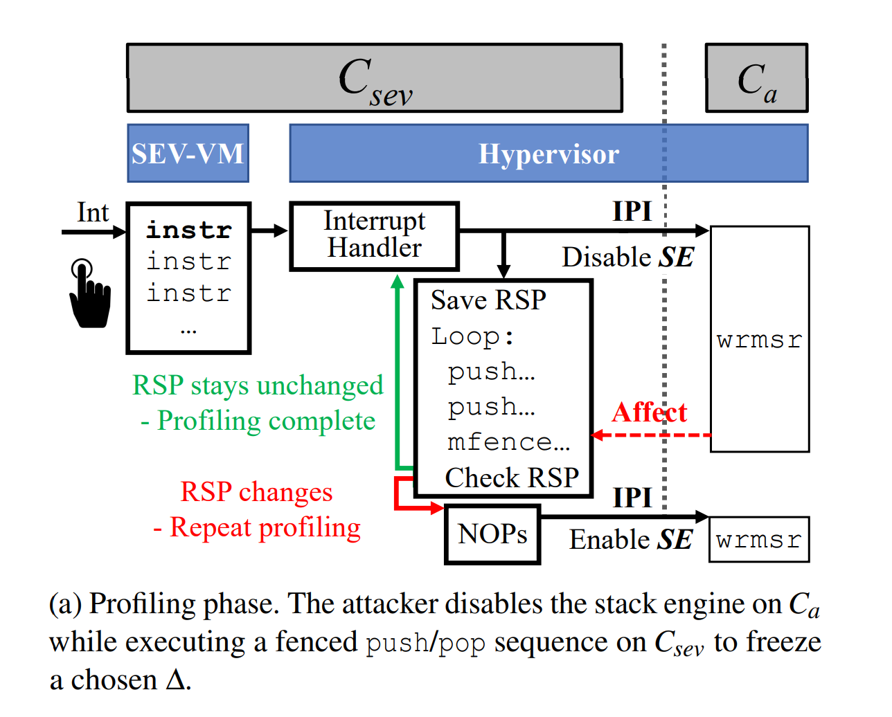恶意的云提供商可以通过 CPU 线程切换该控制位,引发连锁反应,影响运行加密虚拟机的同级线程。这种操作会让 CPU “冻结”堆栈指针的架构更新。