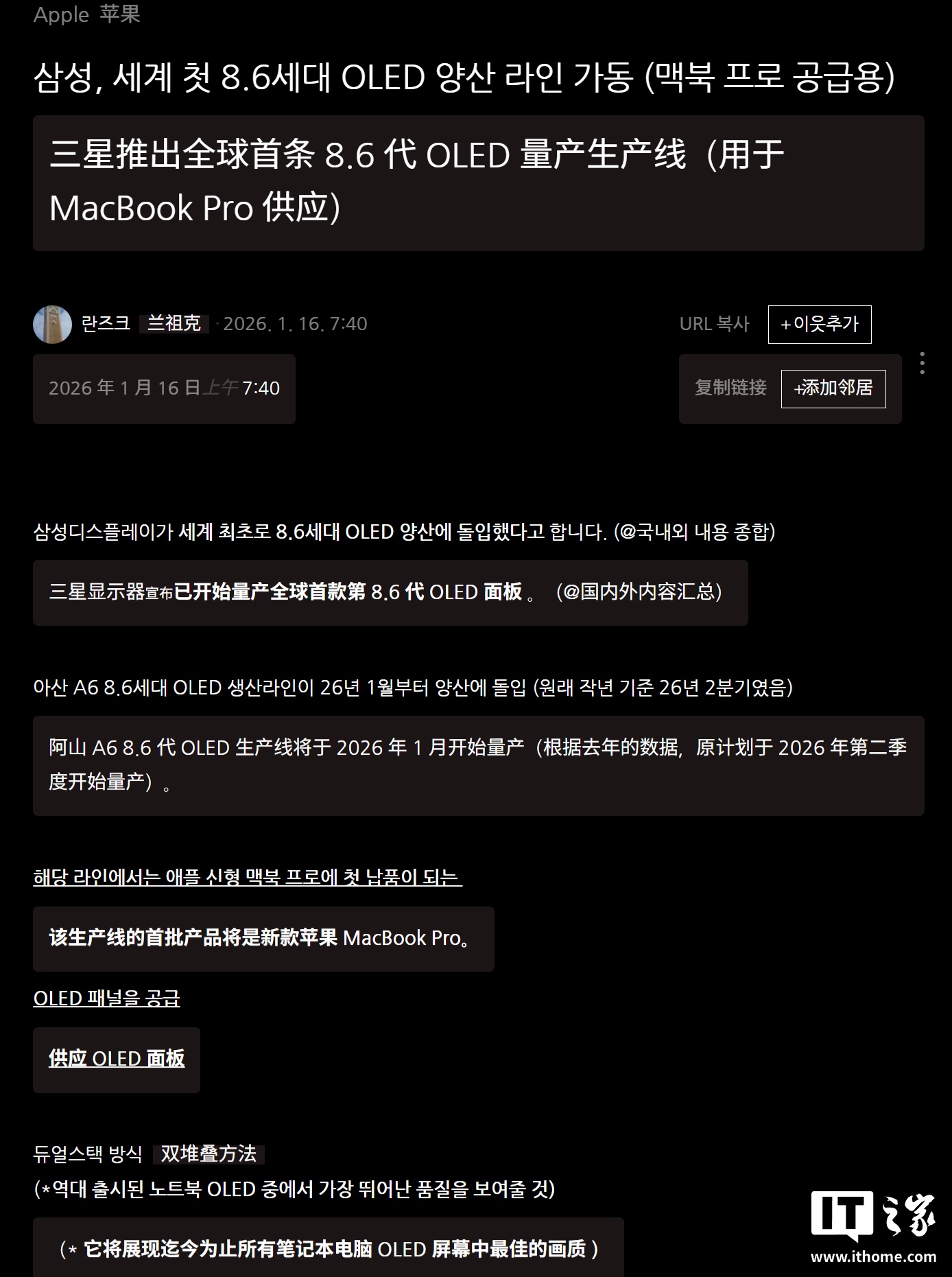 IT之家 1 月 17 日消息,消息源 yeux1122 昨日(1 月 16 日)发布博文,爆料称三星显示(Samsung Display)为苹果的 MacBook Pro,将于 1 月 26 日启动 8.6 代 OLED 面板量产,早于业界预估的 2026 年第 2 季度。