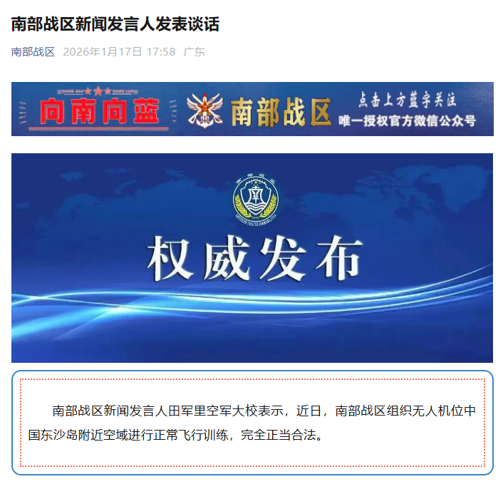 新京报讯 据南部战区微信公众号消息,南部战区新闻发言人田军里空军大校表示,近日,南部战区组织无人机位中国东沙岛附近空域进行正常飞行训练,完全正当合法。