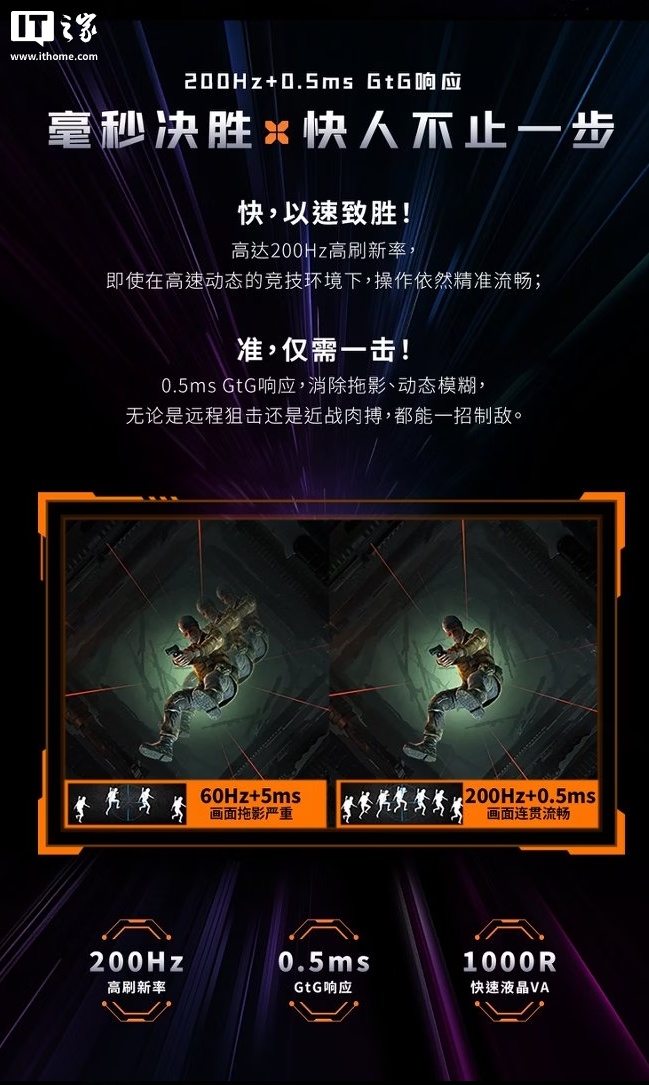 规格方面,这款显示器的原生刷新率是 200Hz,最高可超频至 240Hz,GTG 响应时间可达 0.5ms,峰值亮度可达 300 尼特,支持 HDR 高动态范围技术,覆盖 110% sRGB 色域和 90% DCI-P3 色域,满足游戏之余的日常观影、浏览图片需求。