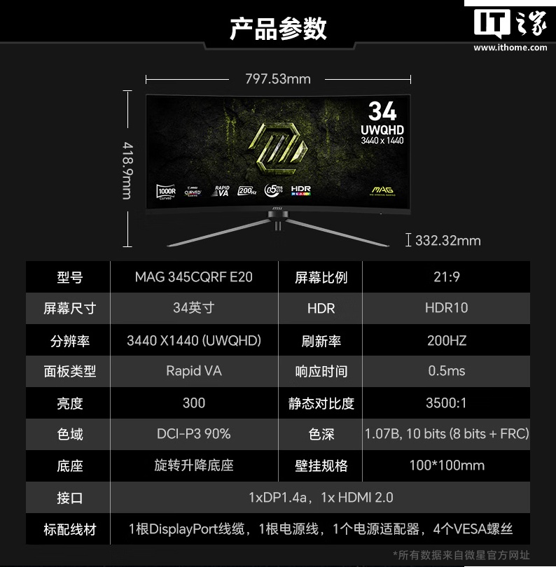 微星推出黑刃 MAG 345CQRF E20 显示器:34 英寸准 4K 240Hz VA 面板,1599 元