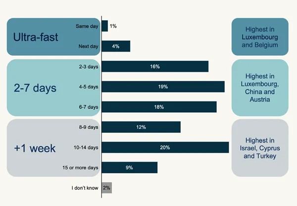 在配送时效方面,跨境购物最常见的送达周期为4—5天(19%)和10—14天(20%),超过一半的跨境订单可在2—7天内完成交付。从区域差异来看,主要从邻近国家采购的市场配送速度最快,而依赖远距离跨境采购的市场则相对较慢。值得注意的是,送达时间超过15天的包裹占比已从2020年的29% 大幅下降至2025年的7%,跨境物流效率持续改善。
