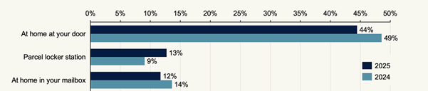 在配送方式选择上,2025年包裹柜的使用率显著提升。调查显示,44% 的消费者选择送货上门,13% 选择包裹柜取件,12% 选择投递至邮箱。