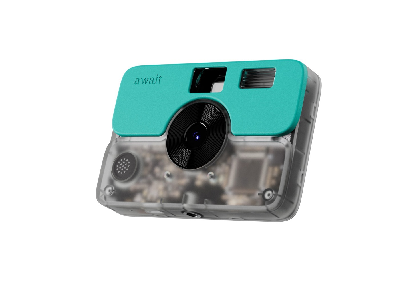 从外观来看,Await 像是一台 20 世纪 80-90 年代的一次性胶卷相机,正面只有一枚小镜头、一个光学取景器和一盏闪光灯,背面则带有一块小屏幕,只能用于显示电池电量、“胶卷”剩余张数以及手机连接状态。