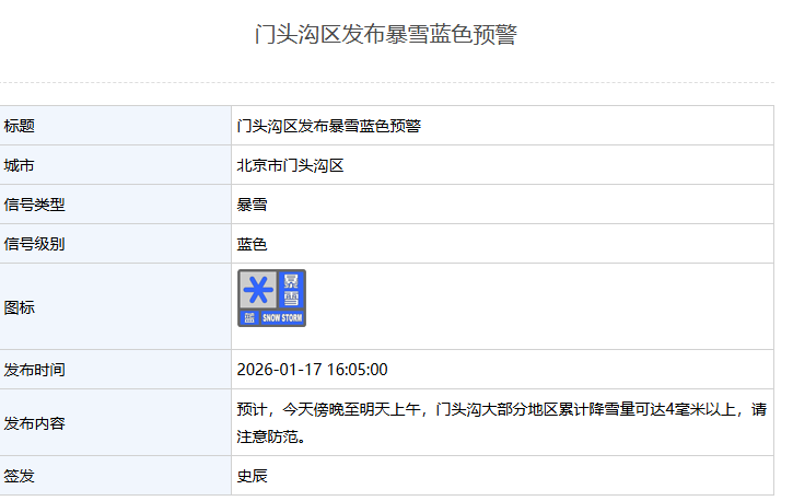 门头沟区发布暴雪蓝色预警