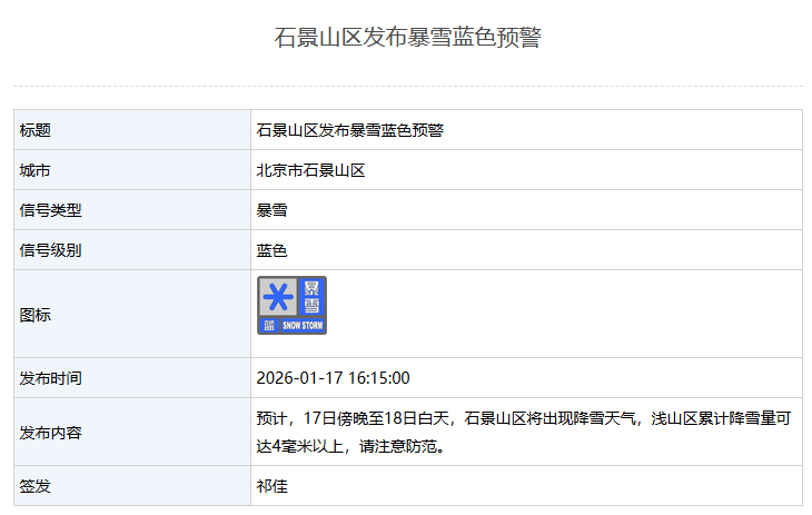 石景山区发布暴雪蓝色预警