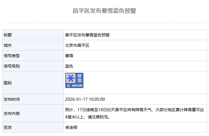 昌平区发布暴雪蓝色预警