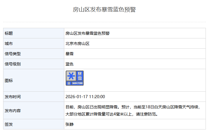 房山区发布暴雪蓝色预警
