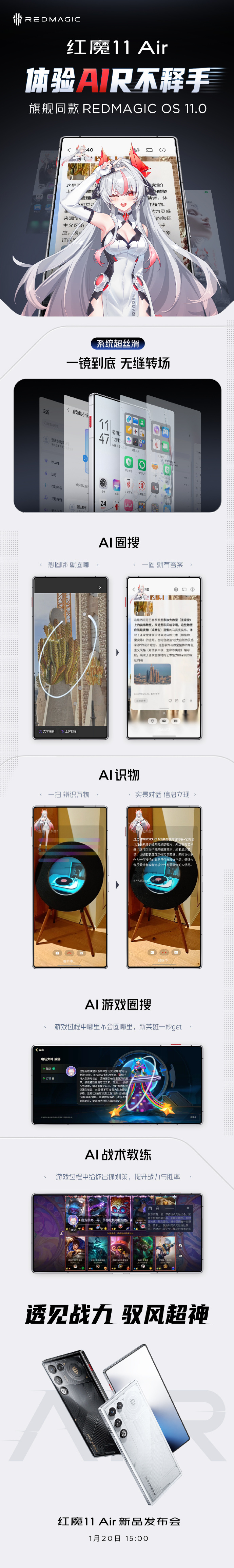 IT之家 1 月 17 日消息,红魔官方今天在微博宣布旗下 11 Air 手机将搭载旗舰同款系统 REDMAGIC OS 11.0,号称“体验 AIR 不释手”,1 月 20 日下午 15:00 正式发布