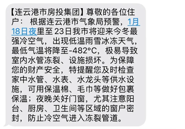 短信中称“1月18日夜里至23日将迎来今冬最强冷空气,出现低温雨雪冰冻天气,最低气温将降至-482℃,极易导致室内水管冻裂、设施损坏”。