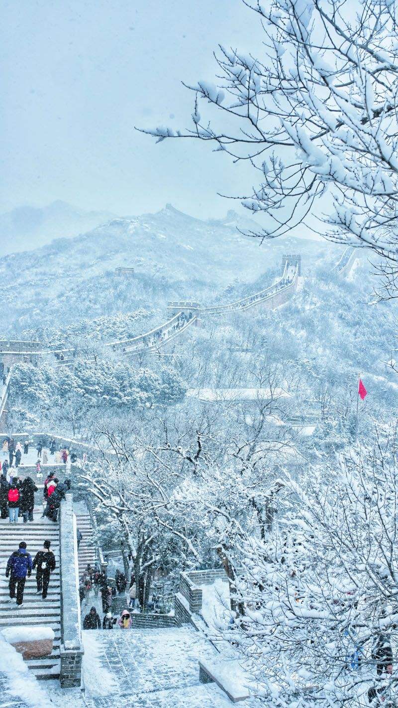 1月18日,八达岭长城景区迎来新年初雪,呈现出北国风光“冰封雪飘”壮美画卷。白雪皑皑中,蜿蜒的城墙与烽火台银装素裹,吸引众多游客和摄影爱好者前来观赏,游客们纷纷捕捉长城雪景的独特魅力,定格2026新年初雪的精彩瞬间。