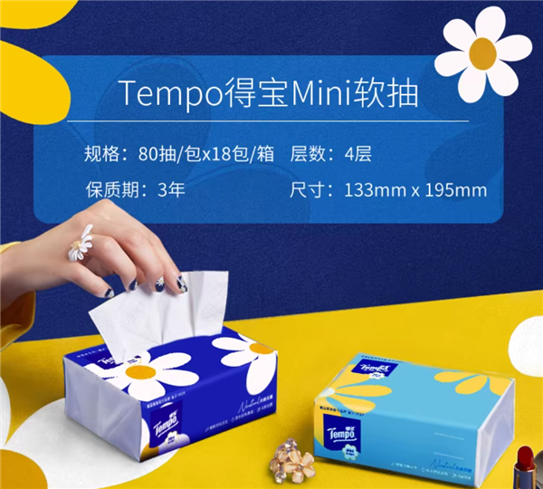 mini码133mm*195mm,折合2.05元/包、不到3分钱/抽。小雏菊与太阳花印,极简潮流风格。