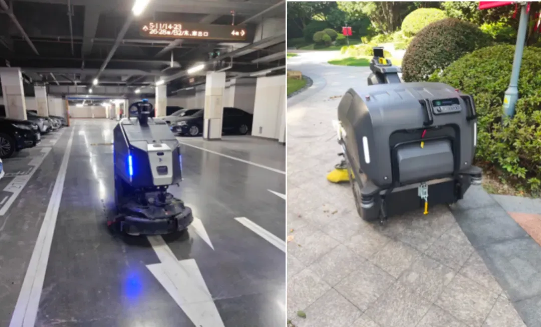 其中清洁机器人的存在感更低,但效率更高。地下车库、室外道路、家门口和电梯间,都能看到按照固定路线工作机器人。