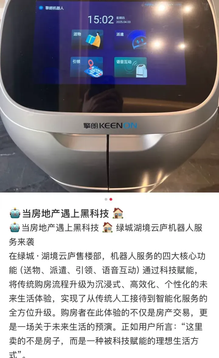 最值得注意的是,近期 “未来感科技私宅”的概念开始流行起来。各个售楼处开始在机器人上卷了起来,门口有机器人引路回答问题、沙盘区有机器人负责讲解、公区有清洁机器人打扫都算常规。