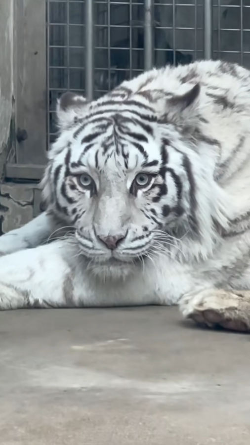 据饲养员介绍,白虎名叫“小孬”,雌性,今年已经10周岁,是园区的“明星”老虎。因为她是女孩子,性格较为腼腆,小时候有一点胆小,所以就起了这个名字。
