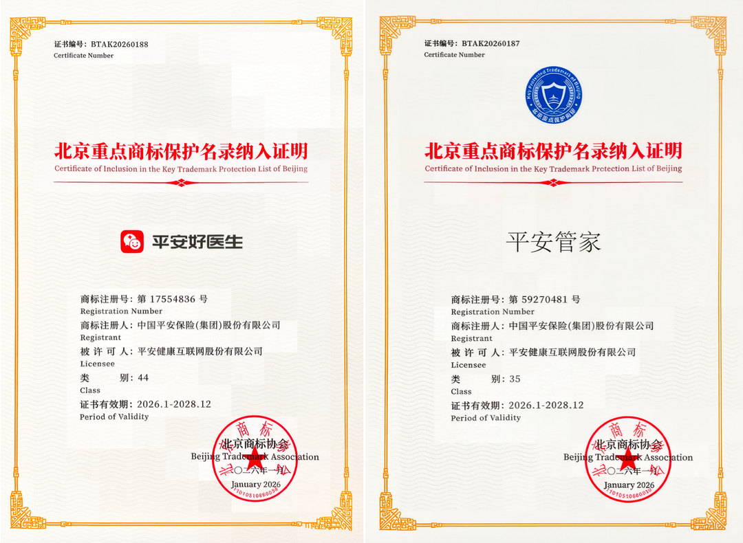 1月16日,由北京商标协会主办的“首届北京商标品牌盛典”在北京隆重举行。作为首都知识产权保护领域的年度盛事,大会正式发布2025年度“北京重点商标保护名录”(下称:名录)。中国平安旗下医养生态业务旗舰品牌“平安好医生”与居家养老服务品牌“平安管家”,凭借深厚的品牌积淀、卓越的市场公信力及扎实的业务护城河,经权威评审严格筛选,双双成功入选。