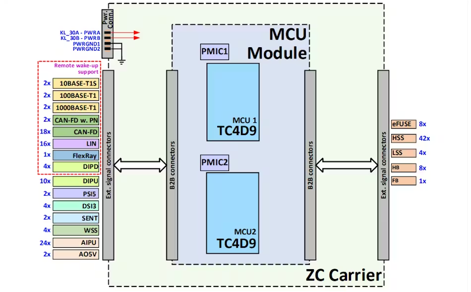 其核心是英飞凌的两台高性能六核TC4x MCU。这些汽车级MCU具备高输入输出密度和计算能力,这两者在高端区域控制器中都至关重要。双MCU解决方案配备了多种连接和网络技术,包括以太网,使其能够作为网关使用。它还配备了智能电源开关,实现更智能的电力网络管理。