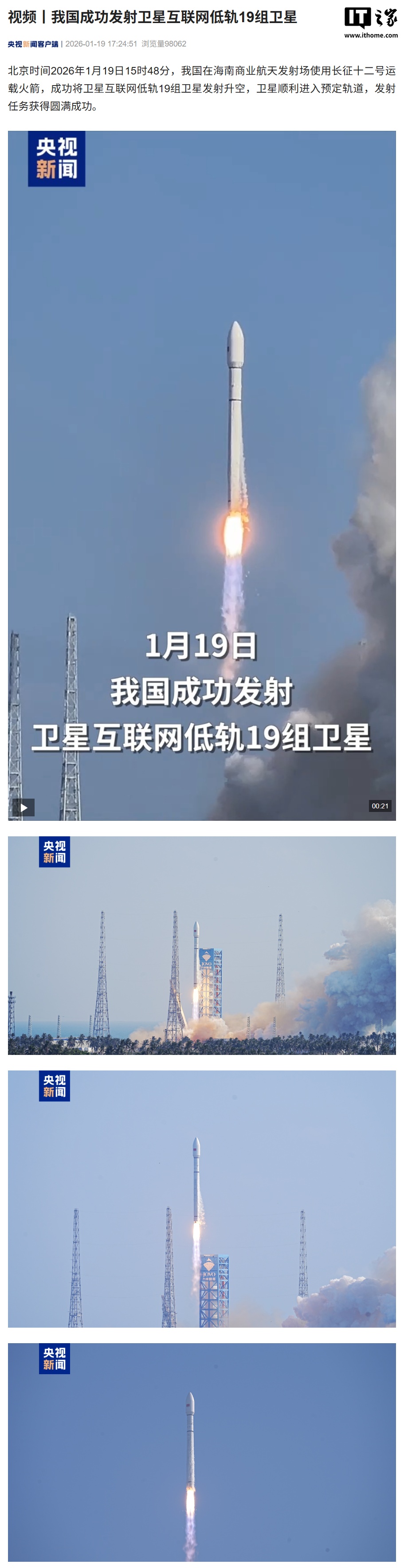 IT之家 1 月 19 日消息,据央视新闻报道,北京时间 2026 年 1 月 19 日 15 时 48 分,我国在海南商业航天发射场使用长征十二号运载火箭,成功将卫星互联网低轨 19 组卫星发射升空,卫星顺利进入预定轨道,发射任务获得圆满成功。