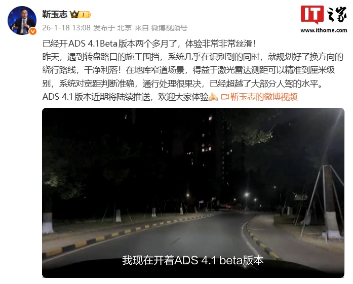IT之家 1 月 18 日消息,华为智能汽车解决方案 BU CEO 靳玉志今日发文确认,华为乾崑智驾 ADS 4.1 版本近期将陆续推送。靳玉志透露,自己已经开 ADS 4.1Beta 版本两个多月,体验非常丝滑。