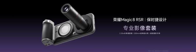 为满足专业创作需求,荣耀Magic8 RSR 保时捷设计还可以选配专业影像套装,内含2.35x等效焦距200mm长焦增距镜、67mm滤镜转接环及专业磁吸手柄。配件支持半按对焦、全按拍摄的专业操作逻辑,大幅提升拍摄仪式感与创作效率,拓展移动摄影创作边界。