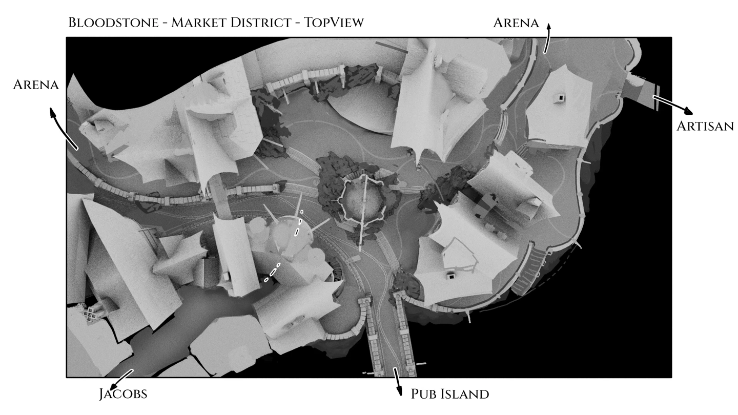 新版概念图不仅描绘了群山环抱的城堡入口作为该地进出通道,还详细规划了市场区、竞技场、工匠区及“酒吧岛(Pub Island)”等内部区域结构,甚至暗示了一条路径,通往名为“Jacobs”角色。