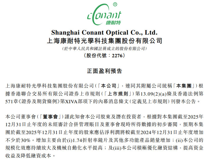 上海康耐特光学科技集团股份有限公司(股份代号:2276,以下简称 “公司” 或 “集团”)根据香港联合交易所有限公司证券上市规则第 13.09 (2)(a) 条及香港法例第 571 章《证券及期货条例》第 XIVA 部项下的内幕消息条文,发布正面盈利预告,告知公司股东及潜在投资者最新经营预期。