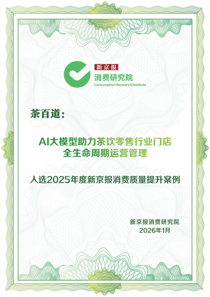 近日,新茶饮企业茶百道凭借“AI大模型助力茶饮零售行业门店全生命周期运营管理”的数智化实践案例,入选新京报消费研究院评选的2025年“消费质量提升年度案例”。
