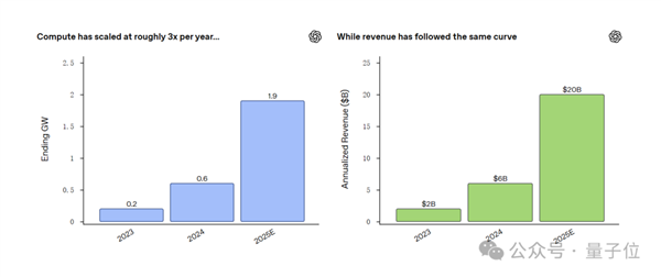 具体而言,2023到2025年间,OpenAI算力增长9.5倍,收入也呈现出相同的增长曲线,同比增幅达到三倍,三年内增长了10倍。