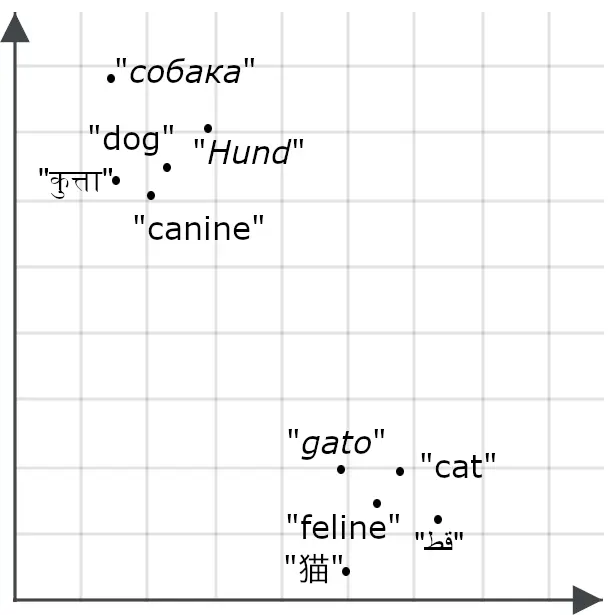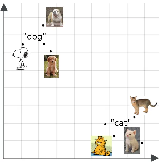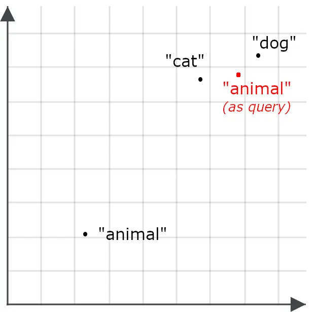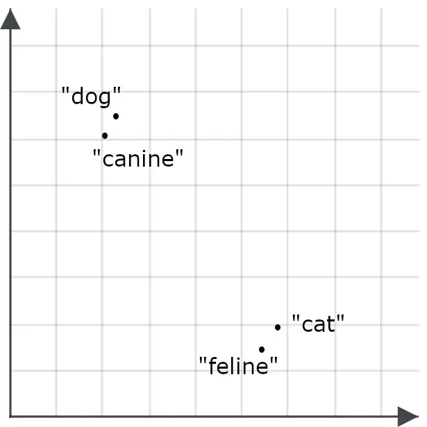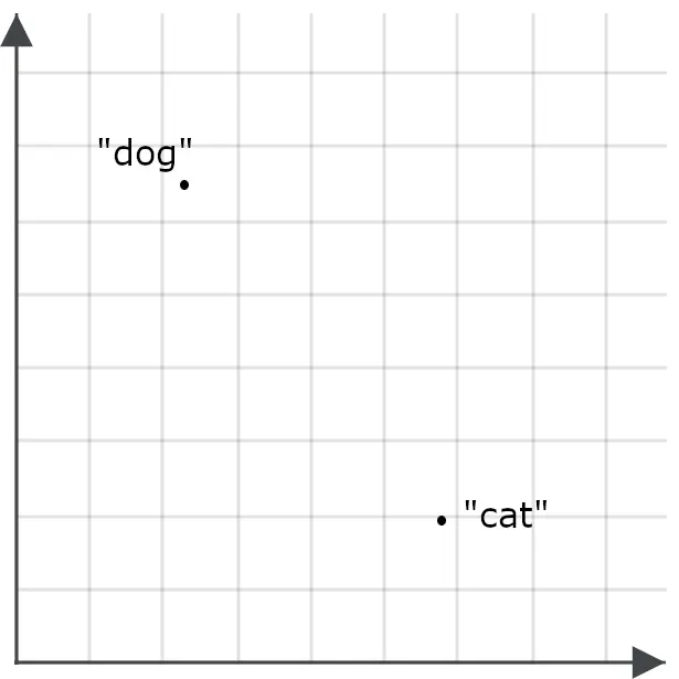 为了理解这对搜索应用为何重要,可以想象单词 “ dog ” 和单词 “ cat ” 各自对应为空间中的两个点: