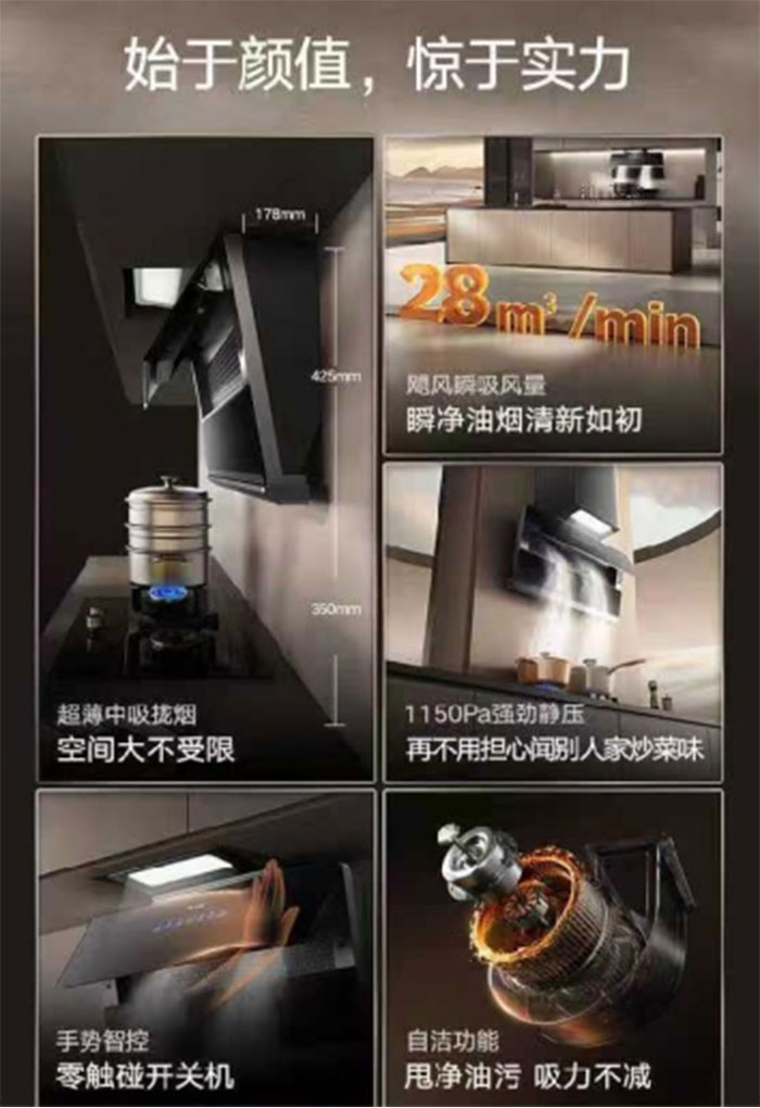 其超薄中吸式设计,不仅视觉上简约轻盈,释放更多厨房上层空间,更符合油烟自然升腾规律,近距离拢烟,效率倍增。内置的自动巡航增压功能能实时感知烟道阻力,智能调节风量风压,确保排烟一路畅通。而旋流空气干洗技术则能自动清洁内部叶轮,长久保持大吸力,省去拆洗麻烦。配合隔空手势智控,操作便捷不留指印,让烹饪过程更显行云流水。