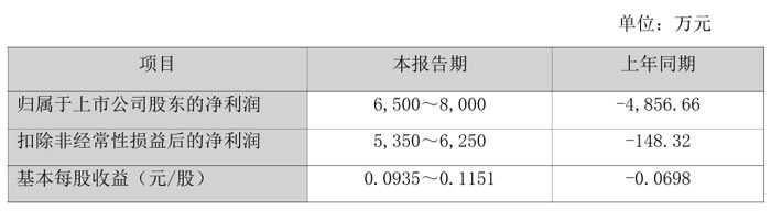 公告显示,业绩预告期间为 2025 年 1 月 1 日至 2025 年 12 月 31 日。报告期内,公司归属于上市公司股东的净利润预计为 6500 万元至 8000 万元,上年同期该数据为 – 4856.66 万元;扣除非经常性损益后的净利润预计为 5350 万元至 6250 万元,上年同期为 – 148.32 万元;基本每股收益预计为 0.0935 元 / 股至 0.1151 元 / 股,上年同期为 – 0.0698 元 / 股。
