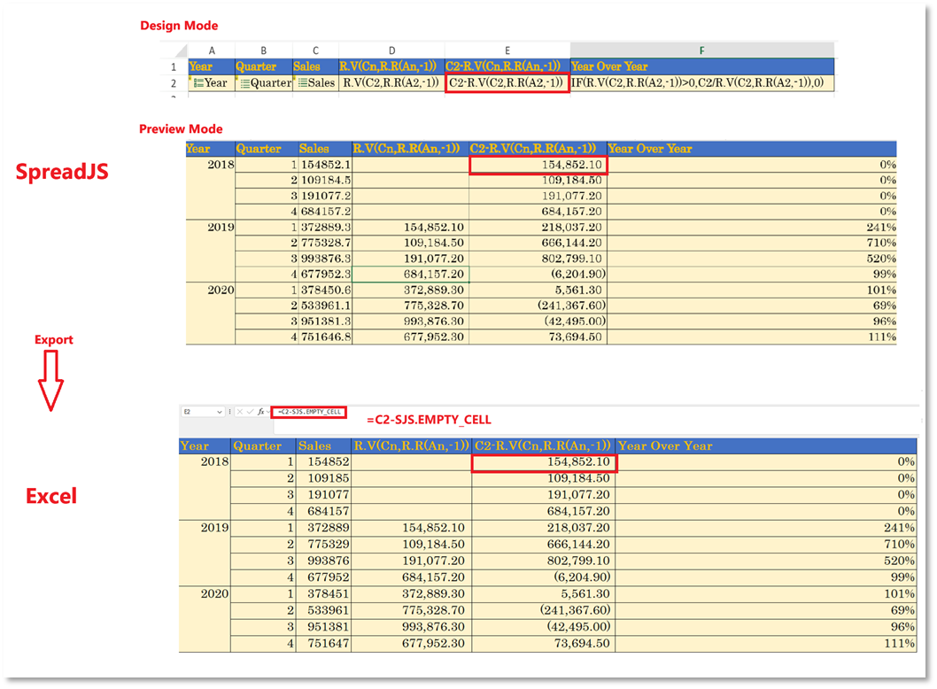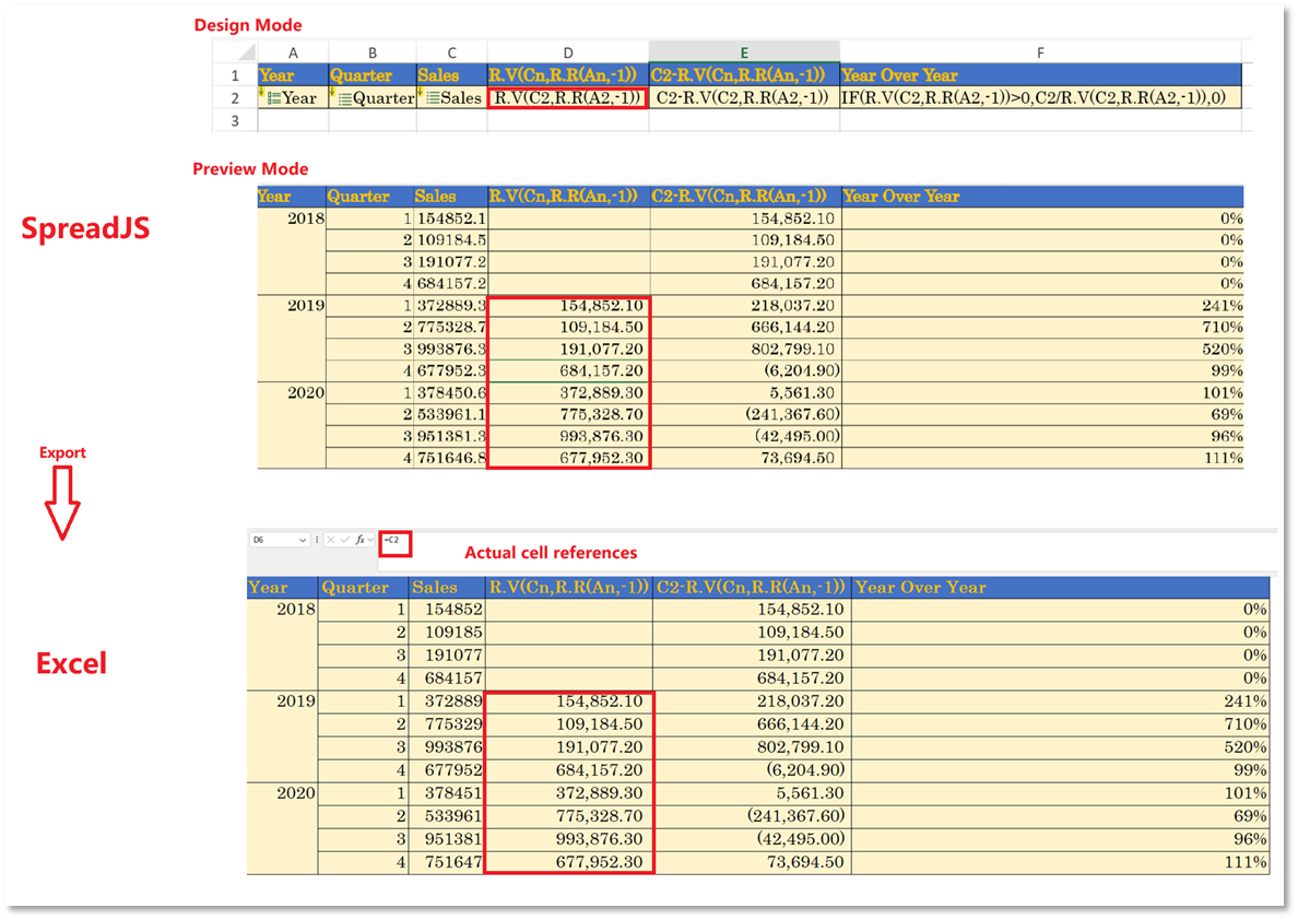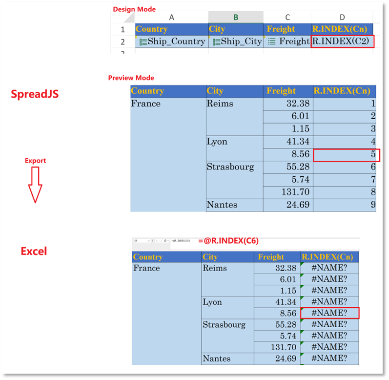 对于如 R.IndexR.RankR.YoY(同比)等 SpreadJS 专有的报表函数,导出时会保留其函数名和引用。虽然 Excel 原生不支持这些函数(会显示为 #NAME?),但这为二次开发或后续回导提供了珍贵的元数据信息。