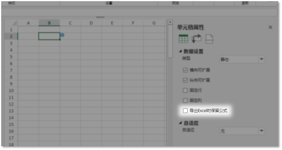 如果您使用的是 SpreadJS 设计器,完全无需编写代码。在”报表单元格”属性面板中,勾选”导出 Excel 时保留公式“选项即可一键开启。