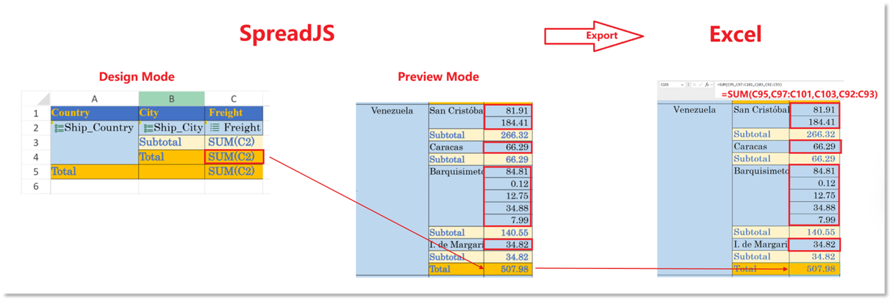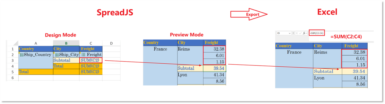 • 不连续区域引用 :对于 SUM、AVERAGE、MIN、MAX 等聚合函数,即使报表生成的区域不连续,SpreadJS 也会智能地将其导出为多个区域的组合引用。
