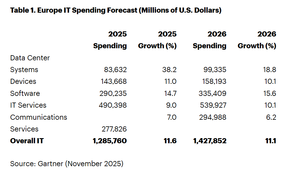 根据Gartner的最新预测,2026年欧洲的IT支出预计将达到1.4万亿美元,比2025年增长11.1%。到2025年底,欧洲的IT支出将达到1.3万亿美元。
