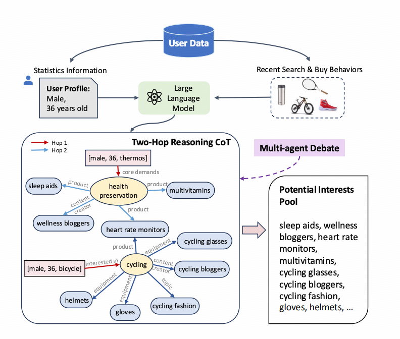 2.通过两跳推理与多智能体多轮辩论机制,提升大模型在兴趣推理中的准确性与稳定性,保障输出质量。