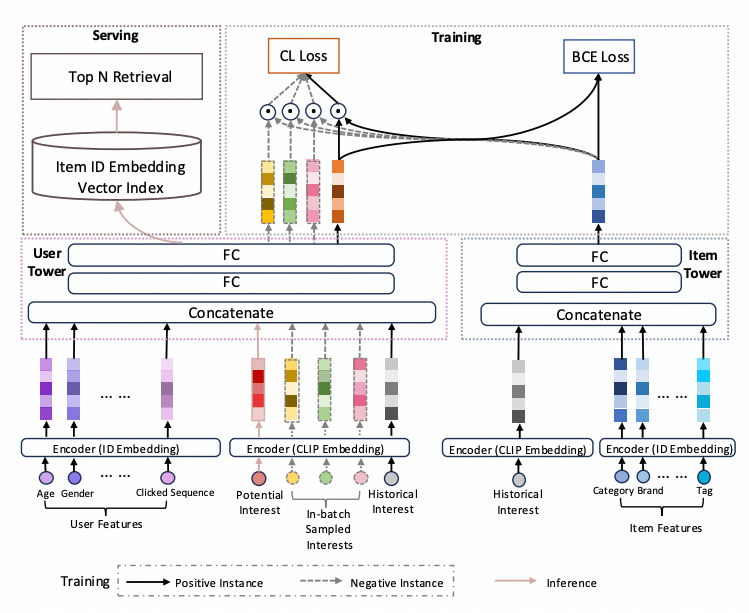 为了兼顾i2i召回和u2i召回的优点,我们设计了一种兼具i2i召回能力的u2i召回模型。具体而言,双塔召回模型是多任务目标,在传统双塔u2i的BCE-Loss基础上,在user塔中引入了基于兴趣对齐的对比学习损失,通过最大化相同兴趣下用户嵌入与物品嵌入之间的相似性,同时最小化不同兴趣下用户嵌入与物品嵌入之间的相似性,从而在预估阶段能够基于用户新兴趣生成与之高相关度的user-embedding。这样得到的embedding用于向量检索召回,召回得到的item集合不仅与新兴趣保持了高度的相关性,同时保持了u2i召回的消费效率高的优点。