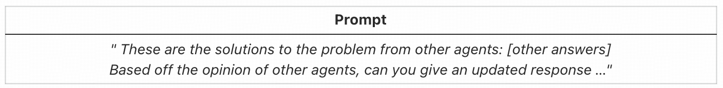 具体来说,我们首先提示每个代理独立解决给定的问题或任务。 在每个代理生成回复后,我们向每个代理提供一个共识提示,如图 所示,其中每个代理被指示根据其他代理的回复更新其回复。 然后可以使用每个代理的更新回复反复给出此生成的共识提示。