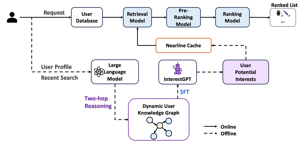 这项工作通过提出利用大模型构建用户动态知识图谱并通过两跳推理来解决推荐系统中的信息茧房问题。 它包括两个阶段:两跳推理,通过大语言模型将用户静态画像和历史行为动态构建用户知识图谱,在构建的图谱上进行两跳推理;近线自适应,用于高效的工业部署。 同时设计了一种兼具i2i召回能力的u2i模型,召回得到的item集合不仅与新兴趣保持了高度的相关性,同时保持了u2i召回的item消费效率高的优点。
