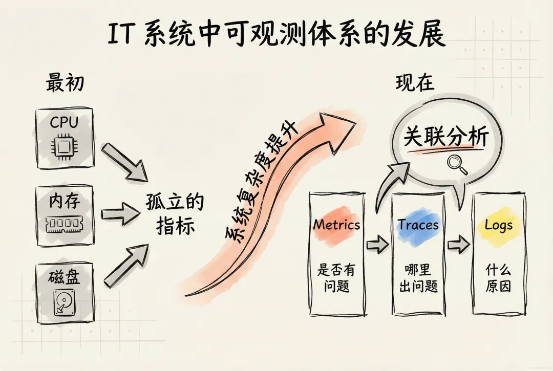 要回答这个问题,我们先简单回溯下:IT 系统的可观测体系是如何走到今天的?