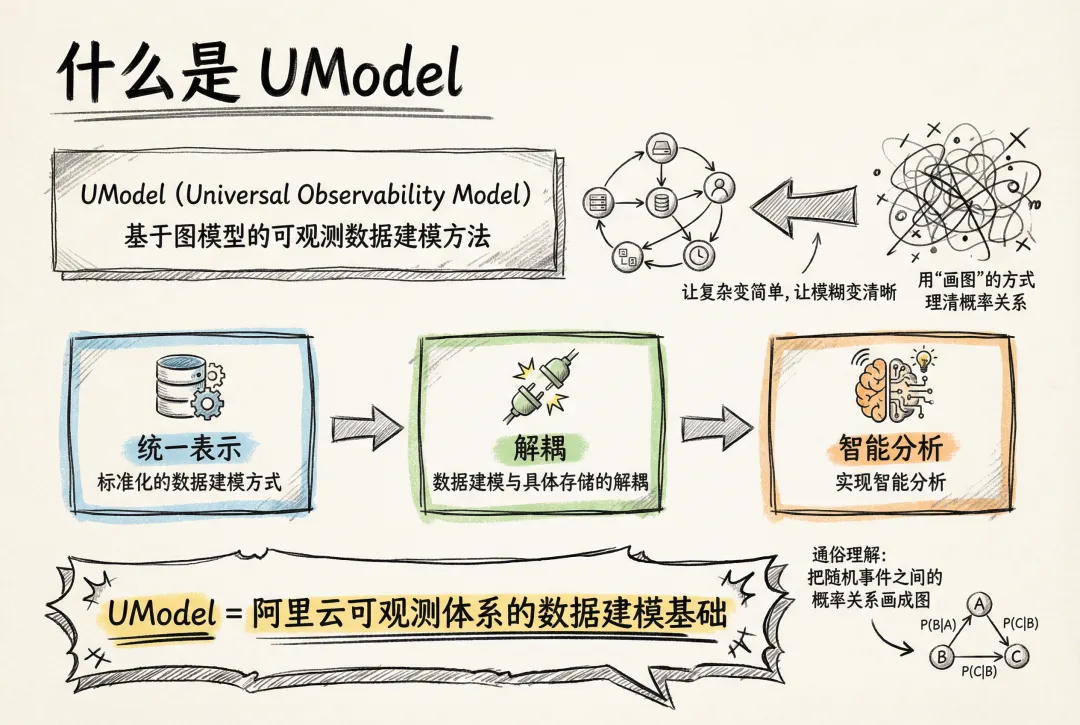 又是图模型,又是建模,一听就很学术。通俗易懂的讲,就是用”画图”的方式,把一堆随机事件之间的概率关系理清楚,让复杂变简单,让模糊变清晰。因此,UModel 旨在通过标准化的数据建模方式,实现可观测数据的统一表示、数据建模与具体存储的解耦,从而实现智能分析。有了 UModel,智能体才能像经验丰富的老运维那样快速定位故障并恢复生产,成为可能。UModel 可以看成是阿里云可观测体系的数据建模基础。