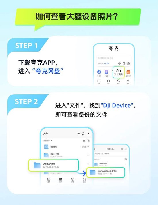 据介绍,用户只需打开大疆专属影像应用DJI Mimo,在“我的”页面中找到“相机云服务”入口,选择绑定夸克网盘,授权后即可使用。